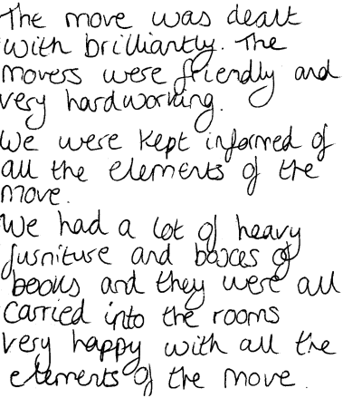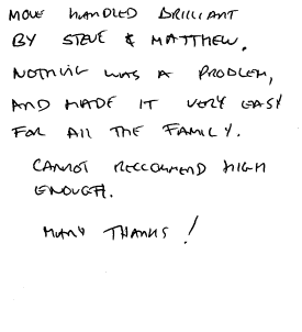 “Excellent staff – particularly Steve the driver, who had a friendly ‘can do’ approach to everything. He eased the stress of the move considerably.”