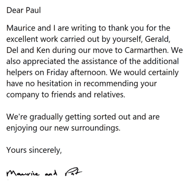 Maurice and I are writing to thank you for the excellent work carried out by yourself, Gerald, Del and Ken during our move to Carmarthen. We also appreciated the assistance of the additional helpers on Friday afternoon. We would certainly have no hesitation in recommending your company to friends and relatives.