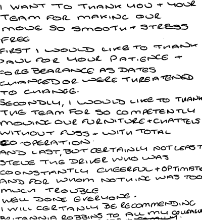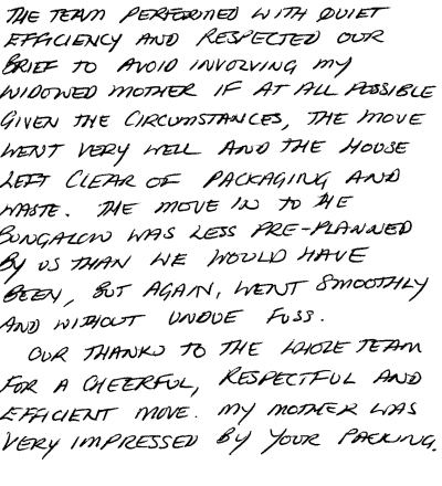 Secondly, I would like to thank the team for so competently moving our furniture and chattels without fuss and with total co-operation.
