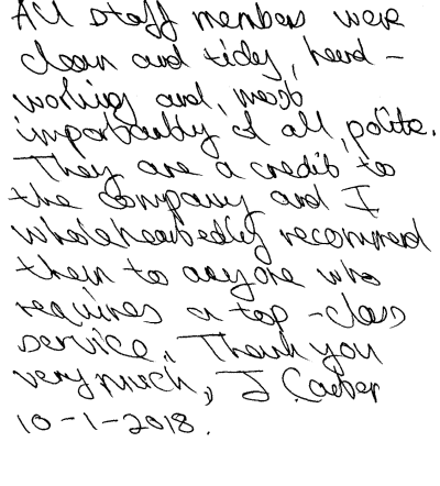 “All staff members were clean and tidy, hard-working and most importantly of all, polite. They are a credit to the company and I whole heartedly recommend them to anyone who requires a top-class service. Thank you very much.”