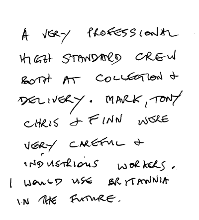 “A very Professional high standard crew both at collection and delivery. Mark, Tony, Chris and Finn were very careful and industrious workers, I would use Britannia in the future.”