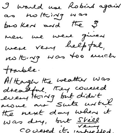 “I would use Robins again as nothing was broken and the 3 men we were given were very helpful, nothing was too much trouble. Although the weather was dreadful they covered everything but didn’t move our suite until the next day when it was dry, but still covered it very impressed.”